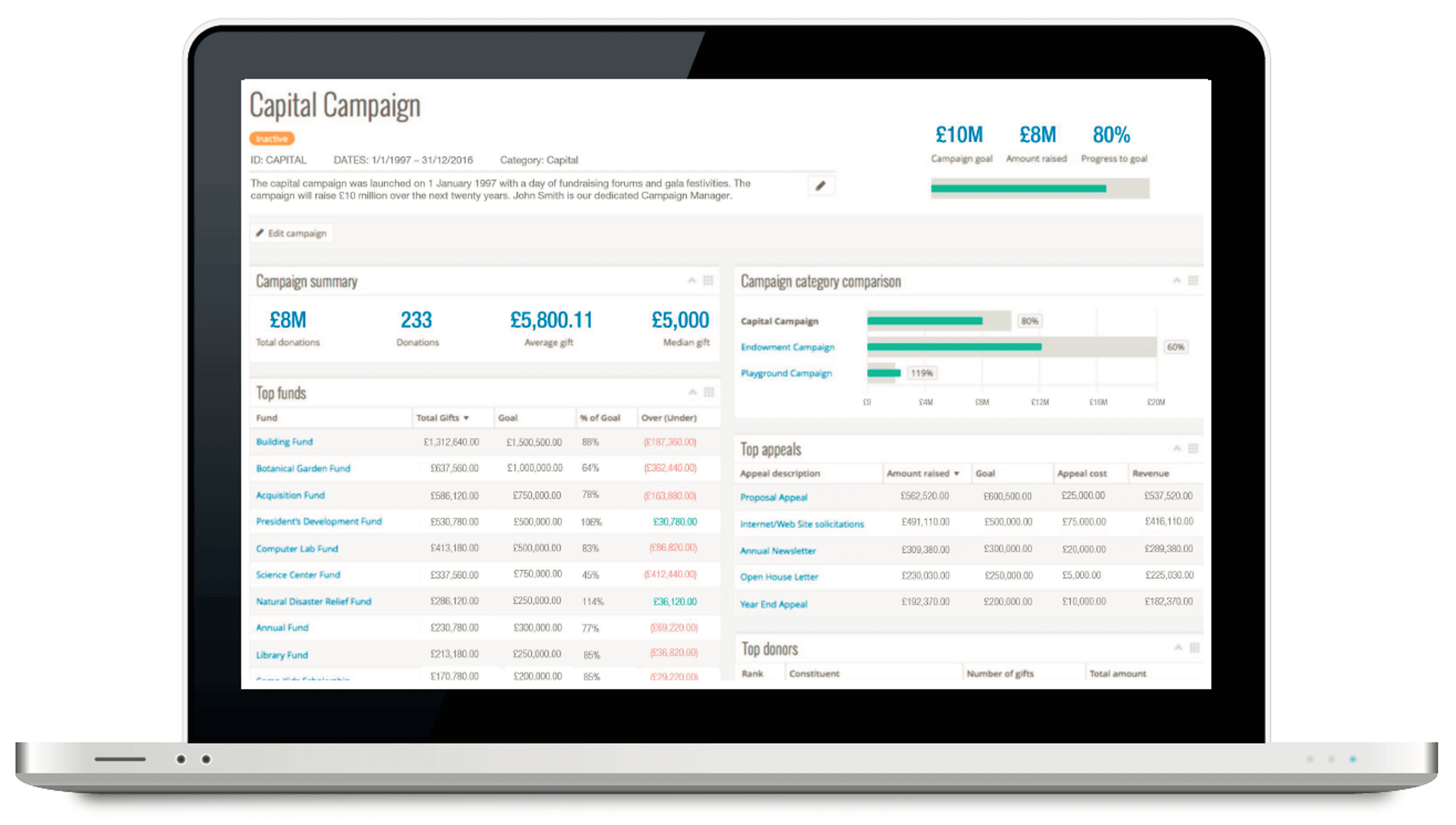 The system offers a wide range of functionality to record and manage the activities of donors, supporters and volunteers. It is very straightforward to use, even for non-technical staff.